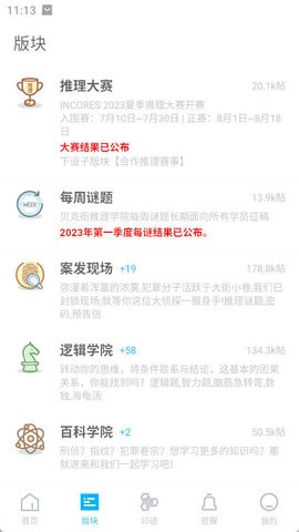 贝克街推理学院手机版用户可以加入不同的推理圈子,找到志同道合的朋友,一同探讨难题、分享心得,形成良好的互动氛围。圈子类型涵盖本格派、社会派、冷硬派等不同流派,还有按地域划分的同城推理社团,方便组织线下狼人杀等聚会活动。