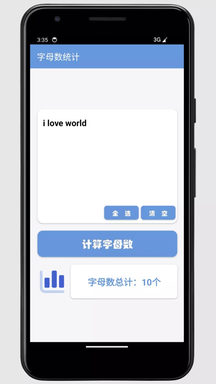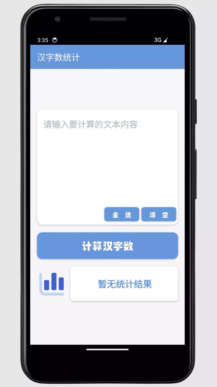 打开应用后点击首页中的任一统计功能按钮,如"汉字数统计"、"字母数统计"或"符号数统计"。系统会进入对应的统计界面。
