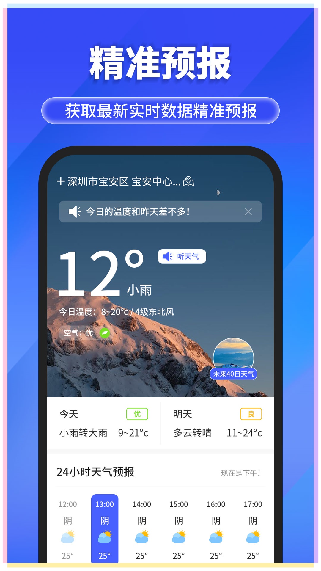 智能提醒:基于位置和天气变化,智能推送穿衣建议、出行提示等实用信息。