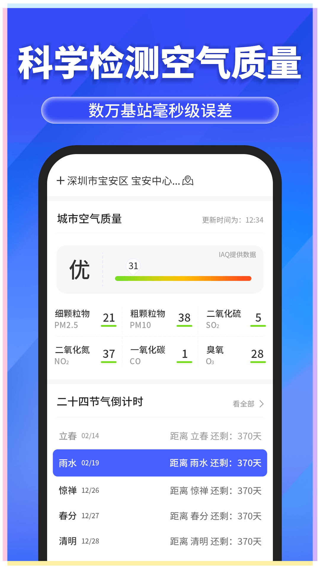 健康关怀:独家整合空气质量指数、紫外线强度、花粉浓度、感冒指数等健康相关数据。