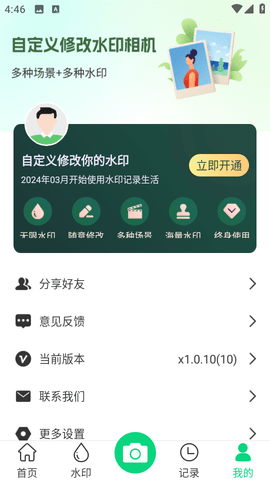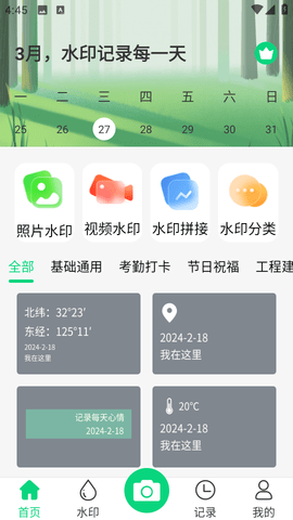 自动添加水印:拍照时自动生成包含时间、地点、天气等信息的照片,支持自定义水印模板和样式选择。