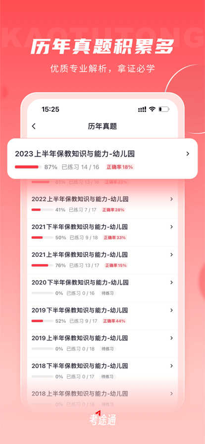 考途通最新版是一款功能强大的题库类手机应用,覆盖职业资格、语言升学、财会经济、建筑工程、软件技术等众多热门考证领域。它不仅提供丰富的题库资源,还整合了名师讲解视频、考试技巧分享等增值内容,打造一站式备考解决方案。无论是准备教师资格考试、软考、英语AB级考试,还是其他职业资格认证,考途通都能根据用户的学习进度和知识掌握情况,智能推荐最适合的练习内容,帮助考生系统化提升应试能力,大幅提高考试通过率。