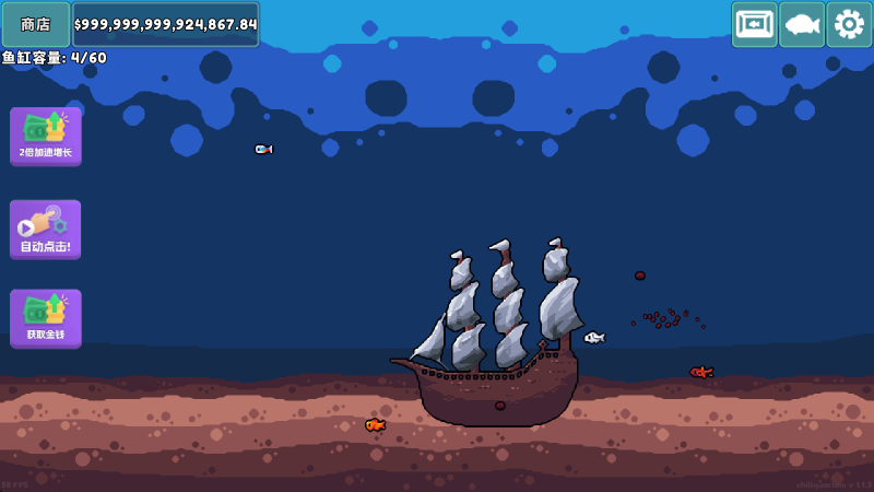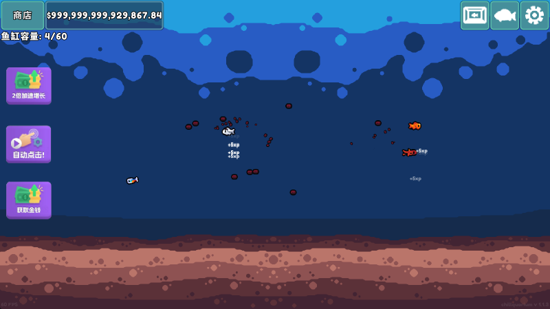 游戏还提供了丰富的管理功能,点击右上角的鱼缸图案可以查看当前拥有的所有鱼类,并随时将它们出售换取金币。在商店的升级界面中,你可以升级鱼粮的品质,或者购买新的鱼缸来扩大养殖规模。拥有多个鱼缸后,你可以随时点击右上角切换不同的鱼缸,方便管理不同类型的鱼类。