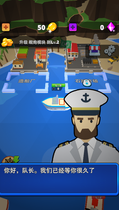 首先进入游戏,移动船只来到造船厂。造船厂提供多种升级选项,玩家可以在这里规划舰队发展方向。