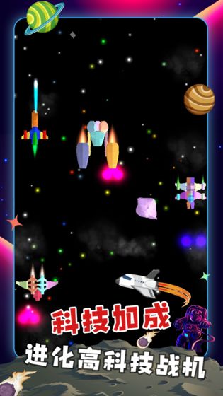 《太空英雄战机》最令人惊艳的莫过于其震撼的视觉效果和紧张刺激的战斗体验。游戏采用了次世代图形技术,打造出绚丽多彩的太空场景和爆炸特效,让你仿佛置身于真实的太空战场。游戏中的战斗节奏紧凑刺激,从遭遇小股敌人到面对大规模舰队围攻,每一场战斗都充满变数。游戏还设计了丰富的成长系统,通过完成任务和击败敌人,你可以获得经验值和各种资源,用来提升战机性能和解锁新装备。特别值得一提的是游戏的随机事件系统,在探索宇宙的过程中,你可能会遇到各种意外事件,这些事件可能会带来丰厚的奖励,也可能让你陷入更大的危机。游戏还定期更新内容,不断推出新的战机、武器和任务,确保玩家始终能体验到新鲜的游戏内容。