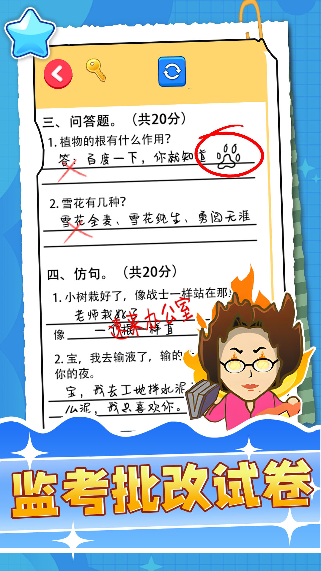游戏内容涵盖语文、数学、英语等多学科题目,大大提升了游戏的知识性和可玩性。游戏巧妙穿插了幽默风趣的师生互动情节,让原本严肃的考试场景变得生动有趣。玩家可以通过达成无作弊监考、高效批卷等成就,解锁特殊道具和荣誉称号,这些设定大大增加了游戏的挑战性和成就感。