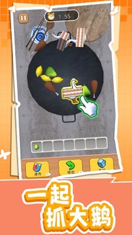 想要顺利通过不粘锅抓大鹅的考验,需要掌握一些实用技巧。游戏初期要优先寻找小物品,这些小物件很容易被忽略,建议前期操作可以快一些以节省时间。进入中期阶段后,不要急于求成,应该先检查表面是否有可以立即获取的三件物品。游戏提供了七个物品栏位,可以暂时存放四个无法立即消除的物品,要合理利用这个功能。