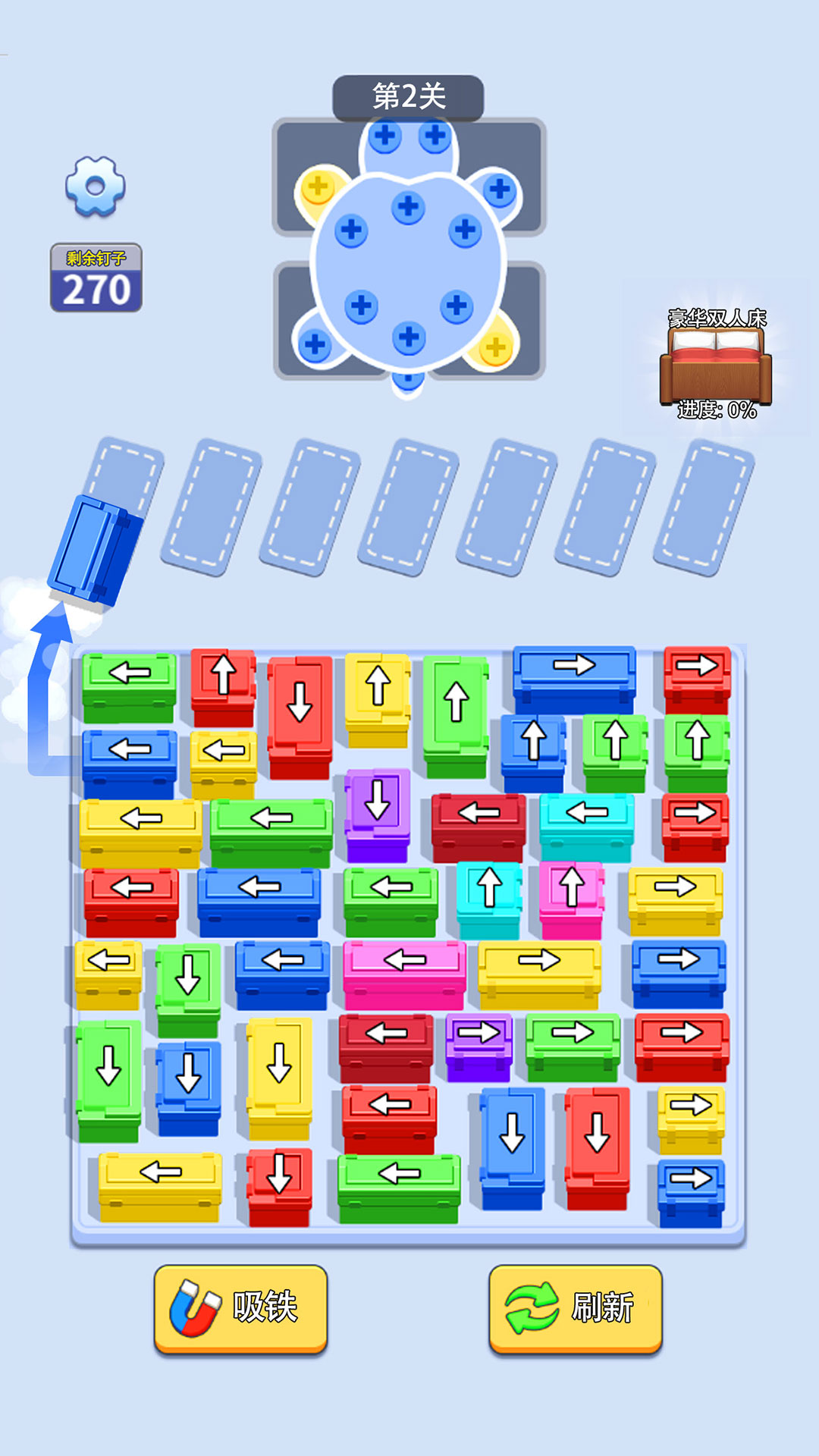 拔钉子打螺丝是一款充满趣味性和挑战性的休闲益智游戏,它将简单的物理操作与策略思考完美结合,为玩家带来轻松愉快的游戏体验。在游戏中,玩家需要通过精准的操作拔出钉子或拧紧螺丝,每一关都设计了不同的障碍和机关,需要玩家灵活运用技巧才能顺利通关。随着关卡的推进,难度逐渐提升,但游戏始终保持着轻松幽默的风格,让玩家在解压的同时也能感受到成就感。