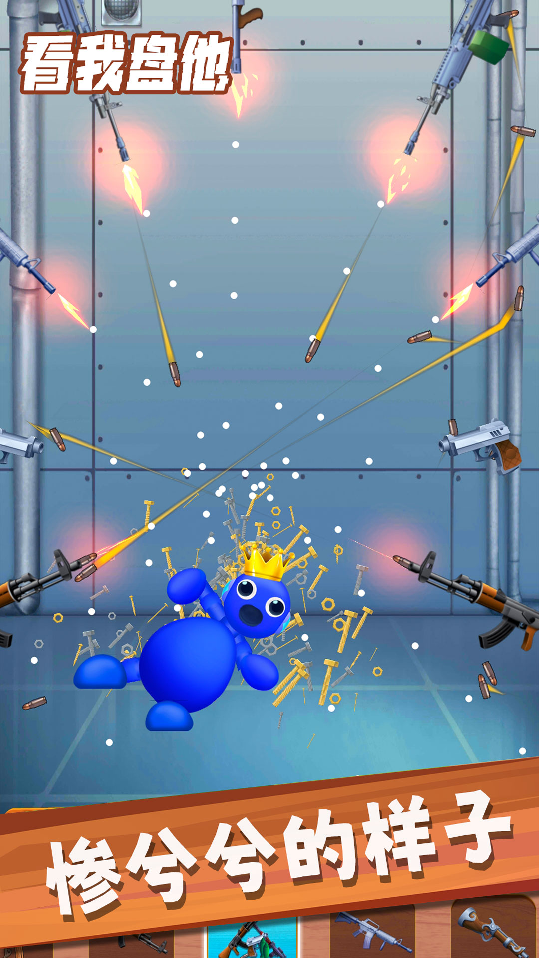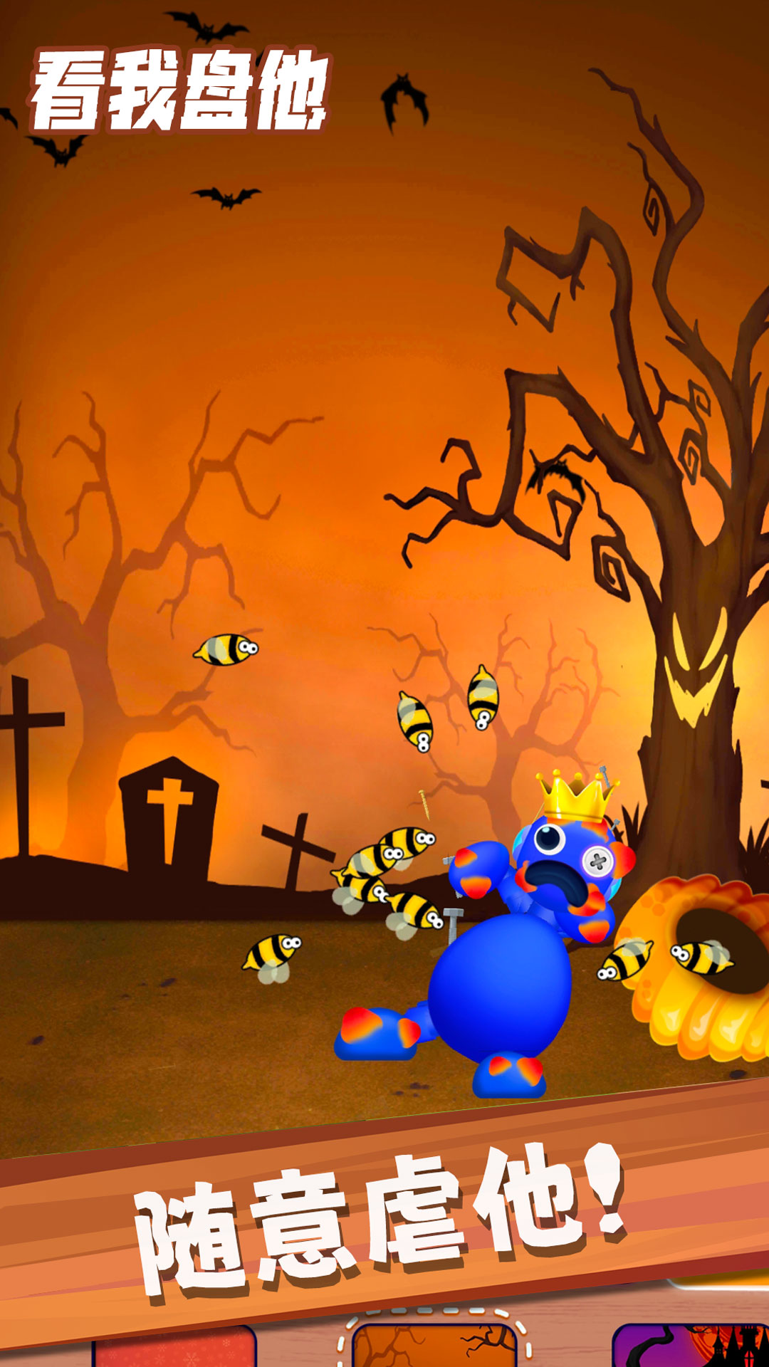 《看我盘他》是一款充满趣味性的解压游戏,主角是一个色彩鲜艳的蓝色彩虹胖子。玩家可以自由选择各种道具,如木棍、炸药甚至枪支,对他进行暴揍。游戏采用轻松点击的玩法,搭配逼真的音效和简洁的卡通画风,让你在每一次暴揍中都能感受到解压的乐趣。看着彩虹胖子被揍得惨兮兮的样子,不仅能释放压力,还能带来一种莫名的满足感。无论是休闲娱乐还是情绪宣泄,这款游戏都能满足你的需求。