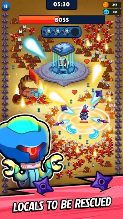 进入游戏,点击屏幕灵活走位,一开始只有飞镖,击杀怪物获得经验,然后升级。游戏操作简单直观,通过虚拟摇杆控制移动,点击按钮释放技能。