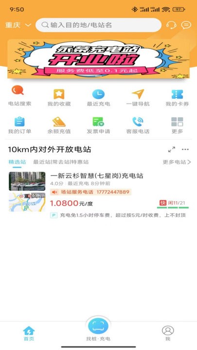 在软件中用户可以搜索附近充电站获取充电站详情信息查看,包括充电桩类型、功率、空闲状态等;