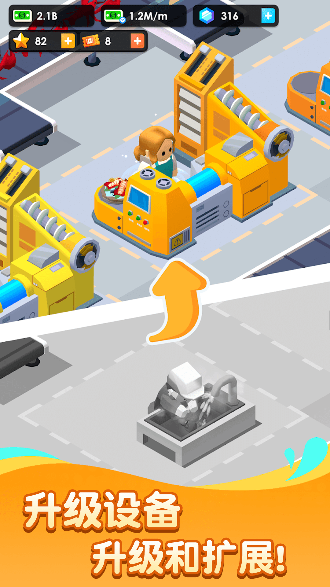游戏提供了丰富多样的玩法内容,玩家可以自由设计工厂的布局,升级各种生产设备,研发新的海鲜配方,甚至开设连锁店铺拓展商业版图。随着工厂等级的提升,你将解锁更多稀有海鲜品种和高级加工技术,为顾客提供更优质的产品。游戏还加入了趣味十足的随机事件系统,比如突发的订单需求、设备故障等,考验玩家的应变能力,让经营过程充满挑战和乐趣。