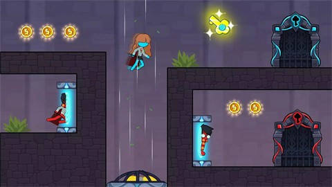 游戏开始时玩家可自由切换操控红色火男孩或蓝色冰女孩,每位角色都有独特的属性特征。火男孩接触蓝色液体会失败,而冰女孩遇到红色火焰同样会游戏结束。通过虚拟方向键精准控制角色移动,在收集散落的金币时要特别注意环境中的动态陷阱。部分关卡需要两位角色默契配合,比如同时触发机关或接力传递道具。随着探索深入,玩家将遇到需要开动脑筋的物理谜题,例如利用箱子搭建通道或调整机关顺序来开辟新路径。