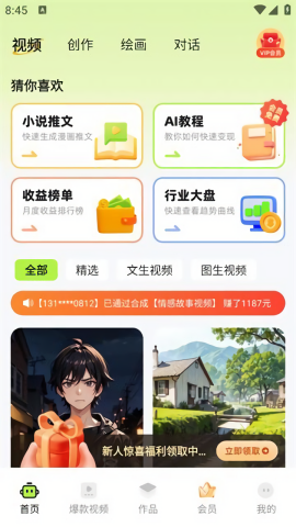 智能对话系统能够激发创作灵感,无论是文字创作、绘画艺术还是项目策划,都能提供精准的个性化建议。专属智能助手功能覆盖从基础文案撰写到复杂故事构建的全过程,准确理解用户需求并提供切实可行的解决方案。智能绘画模块支持多种艺术风格创作,从自然风光到人像绘制,再到抽象艺术表现,都能完美呈现。故事一键成片功能只需输入主题,系统就能自动生成完整内容并制作成专业视频。图集视觉创意功能可将完成的画作自动转化为动态视频,实现视觉元素与创意的完美融合。
