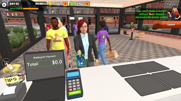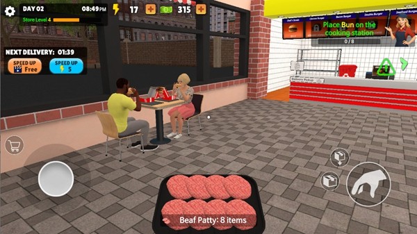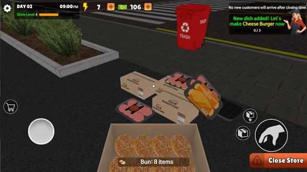 进入游戏,通过手指滑动屏幕进行人物移动,虚拟摇杆操作简单直观;当靠近物资箱时,将圆点调整到箱子上靠近,会出现交互按钮,点击拿起即可,注意体力值消耗;拿起之后可打开查看物资,检查食材新鲜度和数量;将物资运送到烹饪台,合理安排动线提高工作效率;放置好物品之后可以将箱子扔在垃圾桶中,保持工作区域整洁;准备好一定的经营物资后,来到汉堡店外部的招牌处,点击将closed改为open,正式开门营业;开店后前往点单台进行点单以及收银,注意顾客等待时间;根据顾客支付的金钱进行找零,有现金以及卡支付两种支付方式,确保收银准确;点单完成后前往烹饪台进行食物制作,按照订单要求精准配料;制作好的食物可点击上方订单给到顾客,注意摆盘美观度;当食材不够时可以点击电脑购买物资补充库存,建议设置安全库存量。