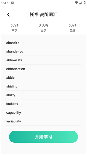 点击开始学习,开启背单词模式,系统会智能安排新词学习和旧词复习,采用间隔重复算法确保记忆效果。