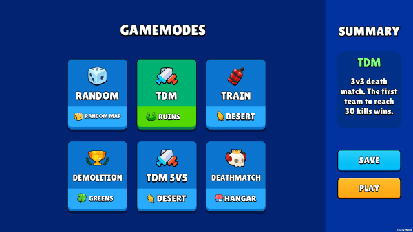 选择游戏模式后点击play。游戏包含多种模式选择,包括5v5团队战、大逃杀、夺旗等,满足不同玩家的偏好。