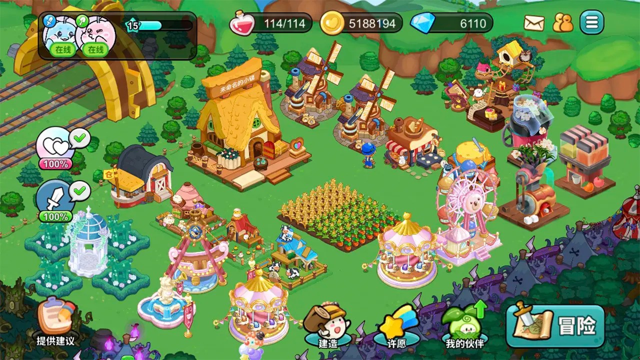 在心动农场中,玩家需要全面管理农场的日常运营,在不同的游戏场景中完成各种有趣的挑战。作为农场主,你可以通过合理规划农场布局、科学安排作物种植顺序来提高生产效率,积累更多资源用于农场建设。而作为战斗家,则需要通过训练萌宠、布置防御设施、升级武器装备等方式来增强农场的防御能力。游戏还设置了丰富的任务系统,玩家可以通过完成任务获得额外奖励,加速农场发展。