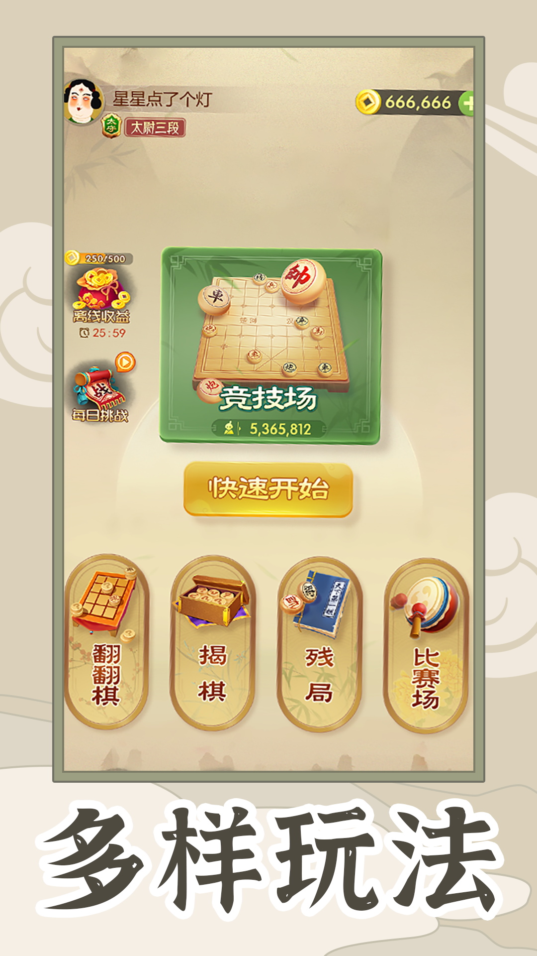 真国风象棋是一款融合了中国传统文化精髓与现代游戏设计的精品象棋游戏,为广大棋迷打造了一个沉浸式的对弈平台。游戏以经典中国象棋为基础,通过精美的国风美术设计、逼真的音效和流畅的操作体验,让玩家仿佛置身于古色古香的棋局之中。无论是新手还是资深棋手,都能在这里找到属于自己的乐趣。