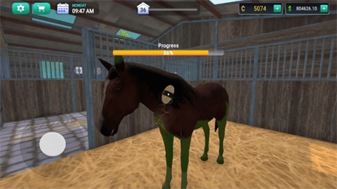 按照指引到达指定位置,使用海绵刷为马匹清洗,完成护理后即可开始营业。清洗环节采用了真实的物理模拟,玩家需要掌握适当的力度和顺序才能获得最佳效果。完成全套护理后,马匹的状态会显著提升,为后续的比赛或表演打下良好基础。