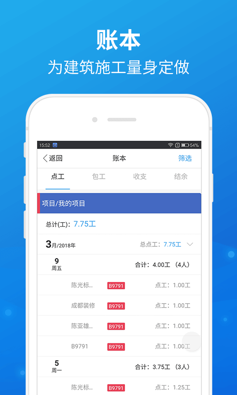 作为专业的建筑用工平台,云力帮既帮助施工老板高效招工、管理账目,也为技术工人提供了可靠的找活渠道,真正实现了双赢。