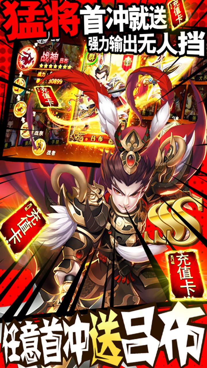上线即送VIP20,888W金币、88888钻石,每天登陆领取充值卡,7天登陆领取千元充值。游戏还设有成长基金、月卡等超值福利,让玩家轻松获得海量资源。充值比例1:500,首充双倍。首充即送三国第一金色猛将—吕布,强力输出无人可挡,若与貂蝉组合羁绊,完爆敌人。开路先锋,名留青史通过指定关卡,即可获得全民奖励。每日签到,签到越多,奖励越多。线下充值返利、道具、钻石更是数不胜数,超多稀有资源等你君临天下。每周还有限时活动,参与即可获得限定皮肤和珍稀道具。