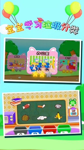 让小朋友在公园、办公室、厨房、客厅等不同的生活场所里,进行扫垃圾、捡垃圾、扔垃圾的过程来学习垃圾分类,锻炼宝宝垃圾分类的能力,体验钟点工和家政人员的辛苦。场景模拟真实生活,帮助孩子将所学知识应用到实际生活中。
