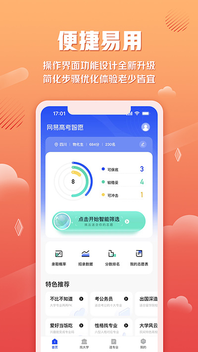 网易高考智愿app是专为高考学子打造的智能志愿填报辅助平台,依托网易强大的技术实力与教育资源整合能力,为考生提供权威、精准、便捷的一站式服务。平台整合全国2800余所高校的最新招录数据,通过智能算法为考生量身定制志愿填报方案,同时提供院校多维对比、专业深度解析等实用功能。无论是院校筛选、专业匹配还是政策解读,都能帮助考生在人生关键节点做出更明智的选择,让每一分都发挥最大价值。