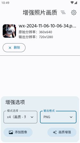 返回主界面,在“增强设置”一栏选择合适的模式和输出格式;用户可以根据图片类型和需求选择16倍或4倍增强模式,同时支持多种常见图片格式,如JPEG、PNG等,满足不同场景的使用需求。
