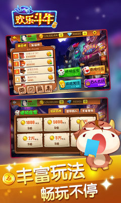 玩法多样,疯狂炸金牛、加注抢庄玩法、百人牛牛、欢乐斗地主等超多玩法等你来。