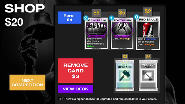 右侧面板详细展示了角色各部位肌肉的发展状况。玩家可以查看不同卡牌的效果说明,根据当前训练目标合理搭配卡组。每张卡牌都有独特的增益效果,比如提升特定部位训练效率或减少能量消耗等。