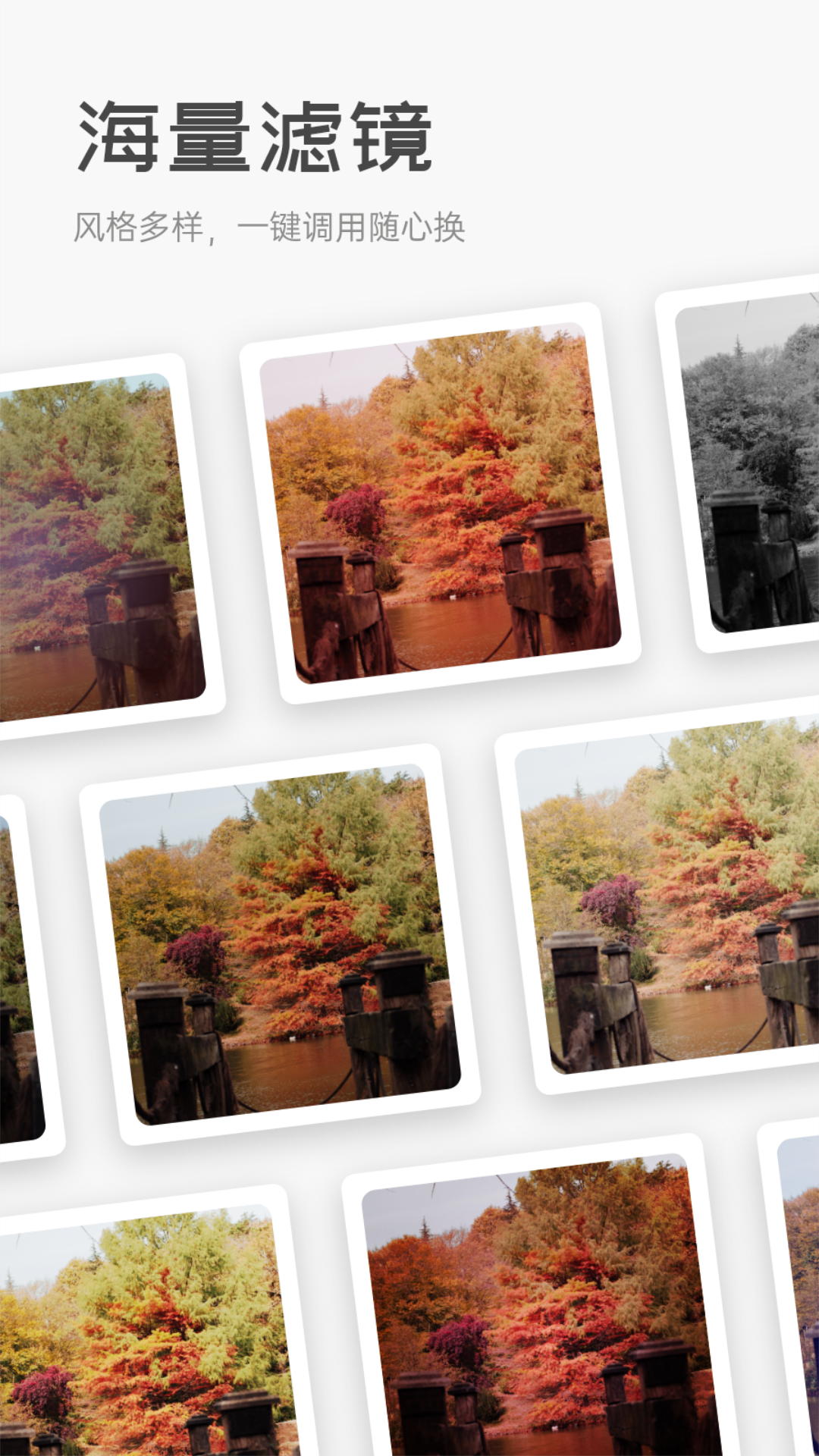简约而不简单的无缝拼图功能,支持最高20张照片的流畅拼接。有你爱不释手的各种照片排版样式,也有你满心期待的花式创意排版,新增智能边缘融合技术消除拼接痕迹。轻轻松松衔接你的照片图集,简简单单合成你的专属图片秀,还能通过手势操作实时调整每张照片的显示区域。