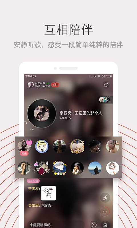 图文互动:升级了聊天室UI设计,增加更多个性化表情和贴纸。新增"音乐心情"功能,可以用图片+文字记录听歌时的感受。