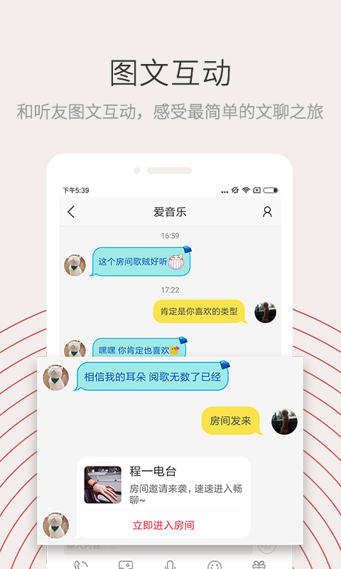 【图文互动】在精心设计的主题房间里,你可以通过文字、图片与听友畅所欲言,分享音乐背后的故事。每个房间都有独特的氛围,满足不同场景的交流需求。