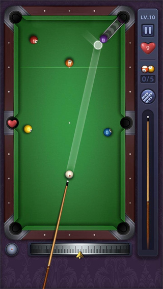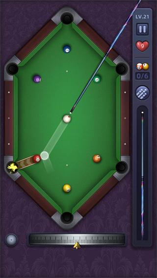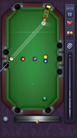 在游戏过程中,玩家需要用球杆击打白球主球,使其撞击其他的目标球;物理引擎完美模拟真实球体运动轨迹,考虑到了摩擦力、旋转力和碰撞角度等复杂因素。创新的"辅助线"系统可以帮助初学者预判击球路线,而高手则可以关闭此功能追求真实体验。