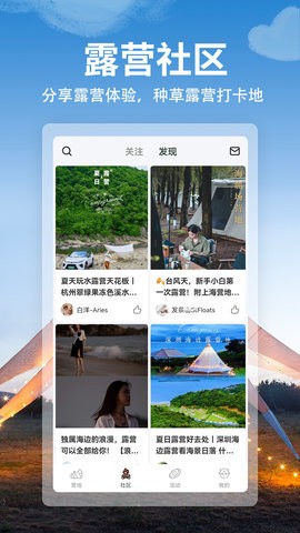 打造国内领先的露营地和露营活动平台,并在社区中自由分享互动,让露营爱好者们能够互相交流经验,共同进步;