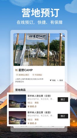 一站式预订露营服务,可预订门票、营地帐篷、营地活动等,亲近自然,远离城市喧嚣,让你的露营之旅更加轻松愉快;