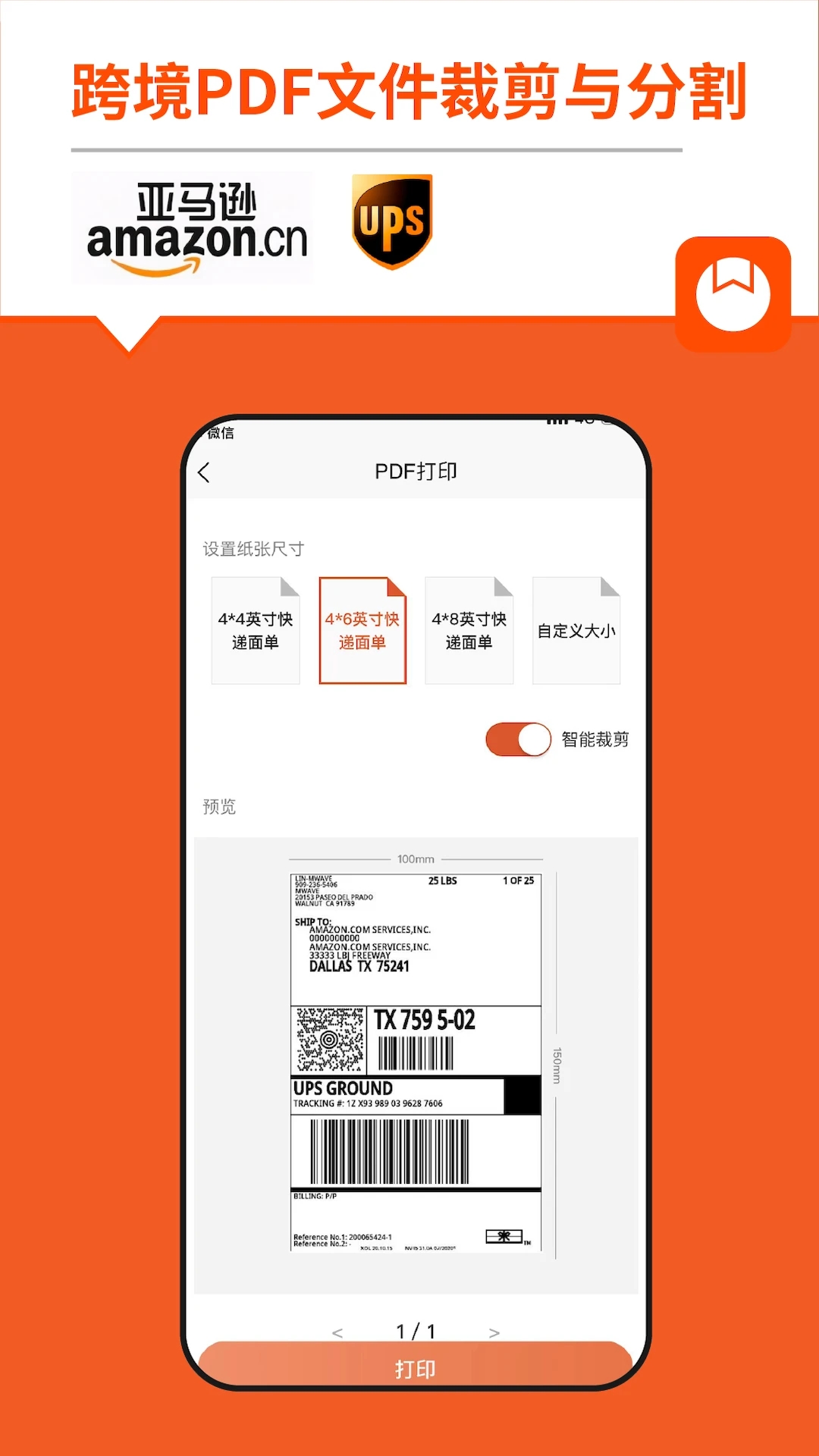 针对亚马逊、UPS等跨境行业PDF文件,支持智能空白,设置自定义尺寸并进行在线打印。