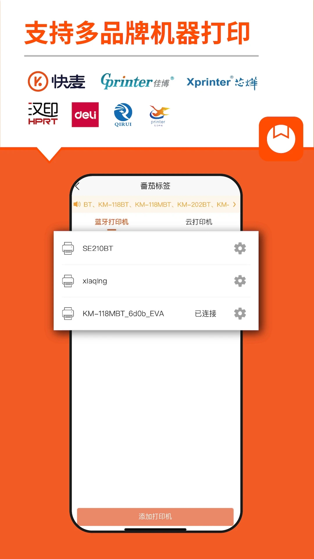 手机蓝牙连接打印,支持佳博、得力、汉印、芯烨、快麦、启锐、辰芯、得印等多品牌打印机。