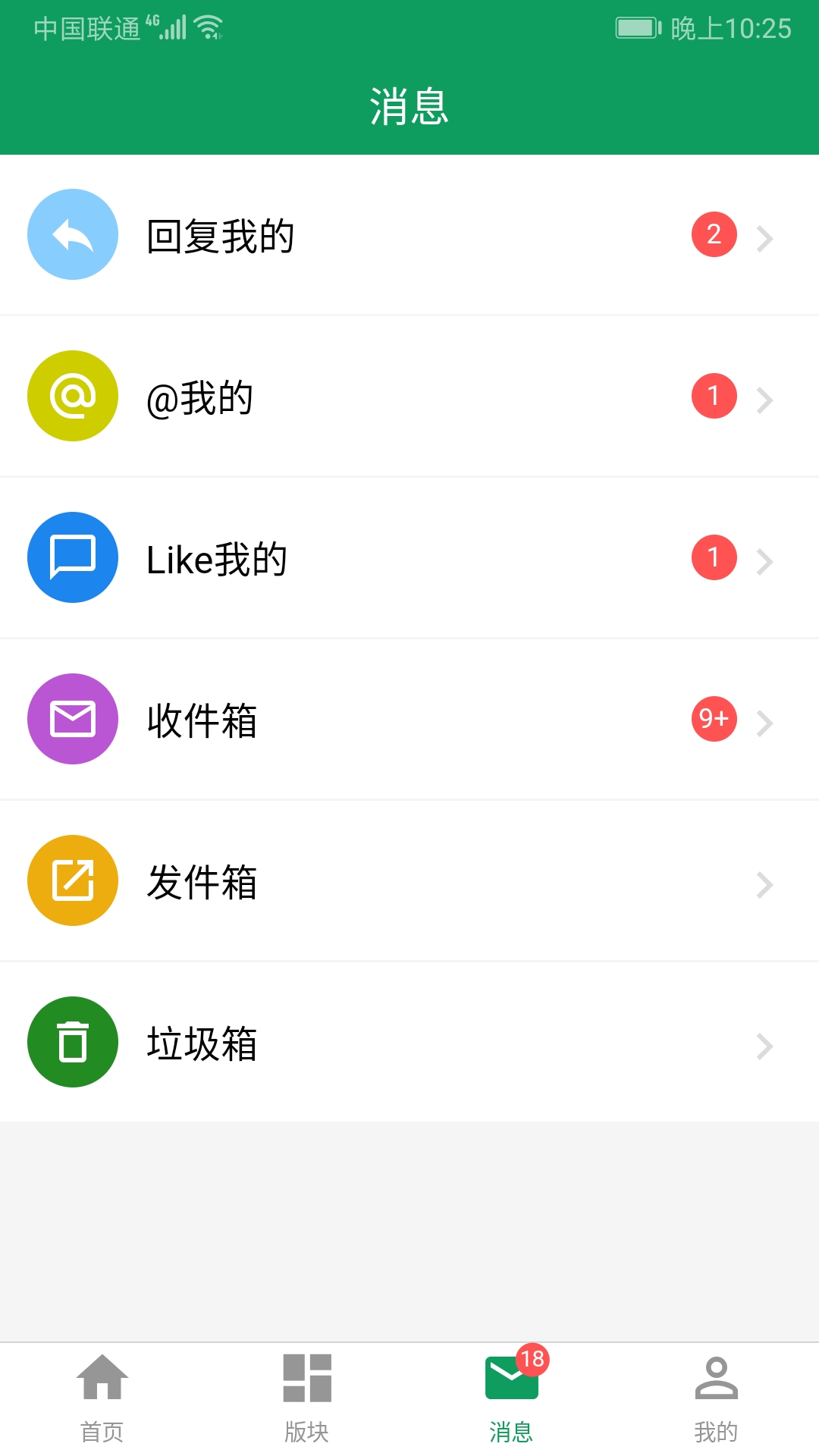 查看消息,包括回复、@、Like和站内信,支持消息分类管理和一键已读功能
