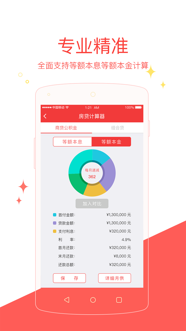 房贷计算器专业版提供全方位的智能计算服务,涵盖房贷、还款、个税、利息和税费等核心功能。无论是商业贷款、公积金贷款还是组合贷款,都能根据用户输入的额度、还款方式和税率等参数进行灵活计算。此外,软件还支持多种还款算法,满足不同用户的需求。全新设计的UI界面和交互体验让操作更加流畅,清晰的月供统计图表帮助用户快速了解还款详情,从而制定最适合自己的房贷计划。无论是首次购房还是二次置业,都能在这里找到专业的计算支持。