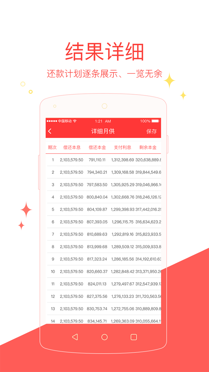 房屋归还明细计算:作为软件的核心功能,用户只需输入贷款金额、年限、方式和利率等基本信息,即可获得详细的还款计划。计算结果包括总利息、每期还款金额、剩余本金和利息等关键数据,帮助用户全面了解贷款成本。通过多次比较不同方案,用户可以轻松选择最优的还款方式,节省利息支出。无论是等额本金还是等额本息,都能在这里找到最适合自己的还款策略。