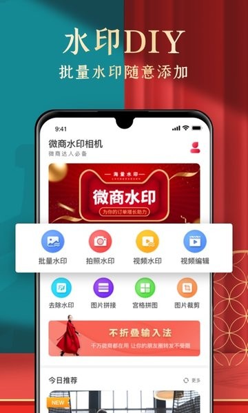 微商水印制作app是一款功能全面的微商工具箱,集图片处理、视频编辑于一体。它不仅支持常规的水印添加功能,还能实现视频拼图、拍照水印、图片海报制作等高级操作。软件特别设计了批量处理功能,可以一次性为多张图片添加统一水印,大幅提升工作效率。无论是个人微商还是团队运营,这款app都能成为您得力的营销助手。