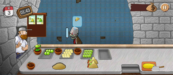 游戏的操作简单易上手,新手玩家可以快速掌握。首先,厨师戴夫是你的主要操作角色,点击戴夫就会弹出补货窗口,里面提供了各种以植物为原型的特色美食。选择想要种植的植物卡牌,将其放置在花盆中,这些植物会自动为你生产食材。当僵尸客人光顾时,你需要观察它们的耐力值,在耐力耗尽前及时提供对应的沙威玛,成功完成订单就能获得金币奖励。游戏采用轻松的点触操作方式,通过不断点击就能制作出各种美食,整个过程流畅而富有节奏感。