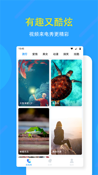 视频铃声:提供上千种创意视频铃声,包含搞笑萌宠、电音特效、游戏动漫、明星艺人等丰富内容,让你的来电变成一场视觉盛宴,展现与众不同的个性风格。
