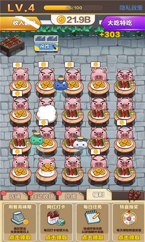 游戏的核心玩法是通过滑动屏幕收取顾客的消费款项。随着游戏进程,玩家可以投资购买自动化设备,实现无人值守收银功能。合理分配金币用于店铺升级是关键策略,这能显著提高客单价和翻台率。此外,购置更多无人机可以大幅提升收银效率,让资金流转更加顺畅。建议玩家优先升级烧烤设备,提高出餐速度,同时注意保持店铺卫生,这些都会直接影响顾客满意度和收入水平。
