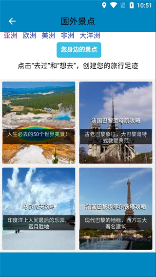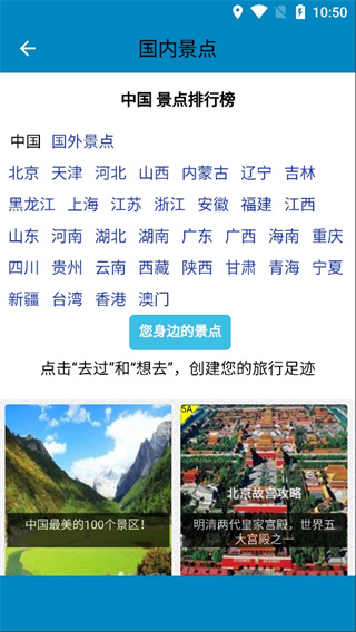 用户可以通过三维景区图像功能,直观查看各个景区的立体风貌,轻松发现周边景点,只需简单点击即可获取详细景区信息。软件提供超清晰的景区实景图片,让用户仿佛身临其境。独特的足迹标记功能,让您在线记录旅行经历和未来计划。全球景点图像库让您随时查阅各国景区,满足您探索世界的渴望。