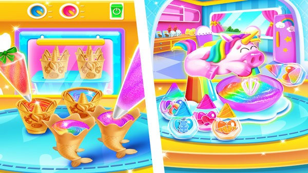 游戏拥有出色的音效和动画效果,欢快的背景音乐和生动的操作音效将吸引各个年龄段的玩家!玩家可以使用各种厨房工具,包括电动搅拌器、烤箱、裱花袋等专业设备,体验真实的烘焙过程。如果你是烹饪游戏爱好者,这款游戏将带给你制作纸杯蛋糕、冰淇淋甜筒的无尽乐趣!七彩缤纷的彩虹蛋糕和细腻的糖霜装饰会让你忍不住想去烘焙店大展身手!在游戏中,你可以化身为美人鱼厨师或独角兽烘焙师,体验最梦幻的烹饪冒险!游戏采用高清画质,所有蛋糕模型都经过精心设计,看起来美味诱人!专业配音演员为游戏录制了详细的指导语音,帮助玩家更好地完成每个制作步骤!你还可以创造出独特的冰淇淋造型蛋糕,让朋友们误以为是真的冰淇淋,带来无限惊喜!
