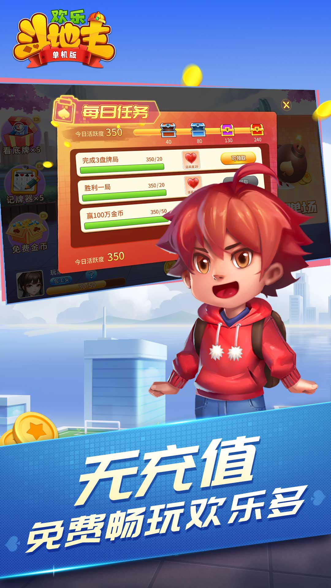 《欢乐斗地主免费》是一款风靡全国的经典扑克牌游戏,完美融合了策略博弈与运气成分,为各年龄段玩家带来无限欢乐。游戏以三人斗地主为核心玩法,玩家需要运用智慧制定出牌策略,同时注重与队友的默契配合。游戏采用清新明快的界面设计,操作直观便捷,即便是初次接触的玩家也能快速上手。除了经典的斗地主模式外,还创新性地加入了挑战模式、比赛模式等多种玩法,满足不同层次玩家的需求。特别值得一提的是,游戏内置的实时语音聊天系统,让玩家在激烈对局的同时也能畅快交流,大大提升了游戏的社交乐趣。无论您是想放松心情还是追求竞技快感,《欢乐斗地主免费》都能为您带来难忘的游戏体验。