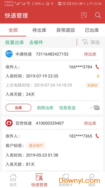 快递入库:通过扫描快递单号快速完成入库操作,支持批量短信通知收件人,大幅节省时间,提升工作效率。